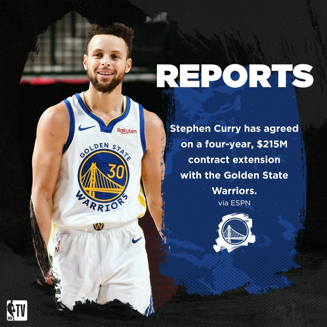 4年2.15亿!库里提前顶薪续约勇士 成历史首人