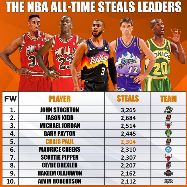 而保罗今年夏天与太阳队完成四年的续约,在他结束职业生涯时,究竟保罗会排在抢断榜第几位,大家可以一起大胆预测一下。