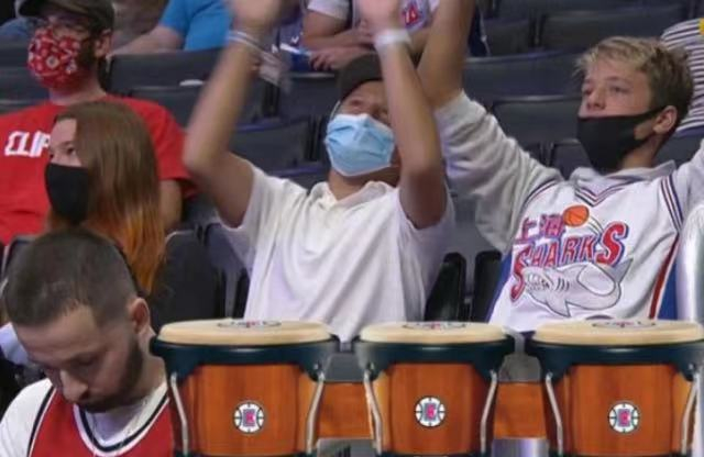 虽然镜头只是一扫而过,并没有看清楚他身上穿的球衣具体号码。但是在洛杉矶的斯台普斯球馆看到有球迷穿着上海大鲨鱼的球衣,确实极为罕见。