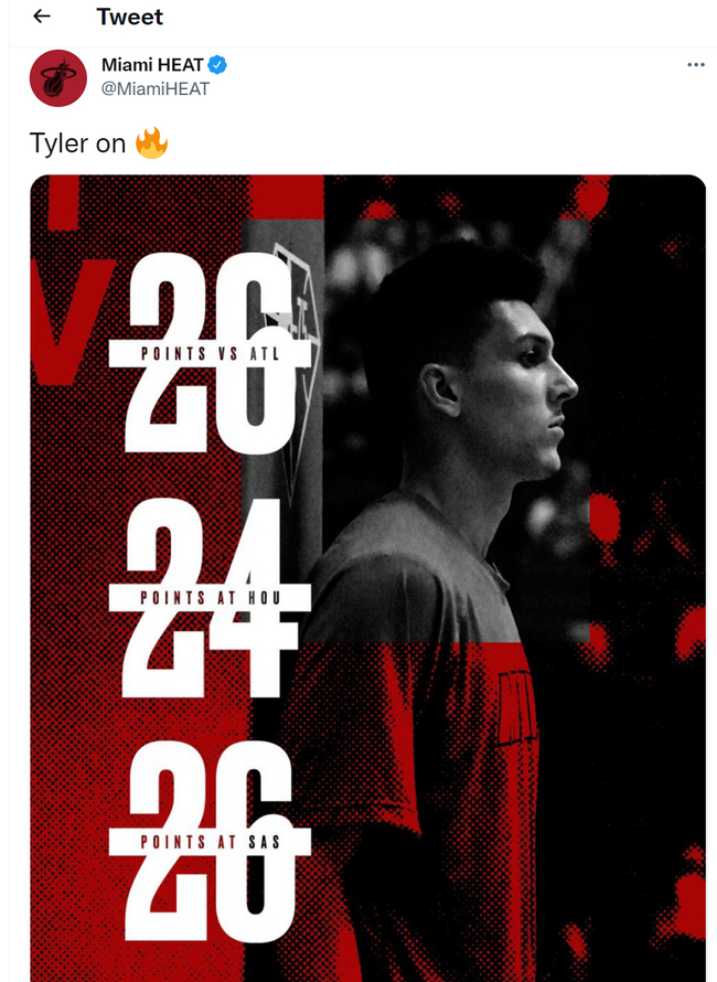 北京时间10月10日,据美媒报道,迈阿密热火官方更新推特并且晒出一项热火球员泰勒-希罗三场季前赛的得分数据,在这三场比赛中,希罗的状态十分火爆。