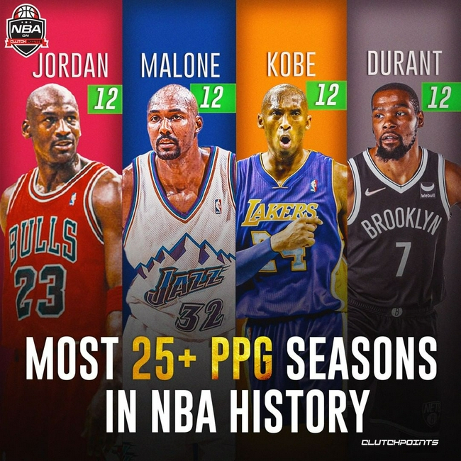 近日,美国媒体就给出了这一份统计,乔丹、马龙、科比和杜兰特,四个人都是12个赛季场均得分25+,这似乎已经是非常强的了,但美国媒体写道:“直到你看到第二张图……”