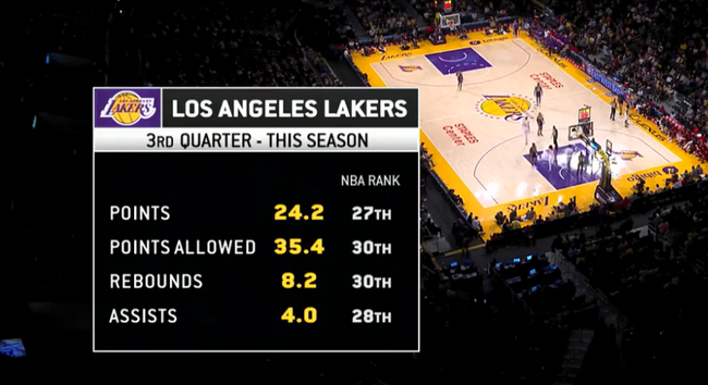 在本赛季此前5场比赛中,湖人第三节场平均只得24.2分,在整个联盟排名第27位。
