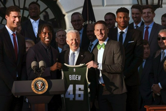 雄鹿官方晒出了全队在白宫参观的照并且调侃道:“字母兄弟体验一下当总统的感觉。”当时,字母兄弟还向总统赠送了一件46号的雄鹿球衣。