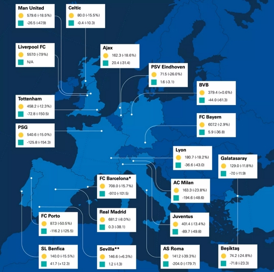 根据毕马威的统计,19/20赛季几乎所有老牌强队营收都不乐观,皇马和拜仁实现微利,尤文图斯亏了将近9000万欧元。