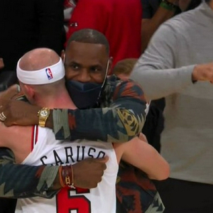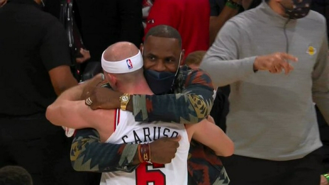 因伤休战的湖人当家球星勒布朗-詹姆斯在赛场上与卡鲁索热烈拥抱,比赛结束后又连续更新两条推特致敬卡鲁索。