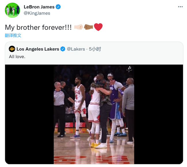 随后,詹姆斯又转发了自己与卡鲁索拥抱的视频,并配文写道:“我永远的兄弟!”