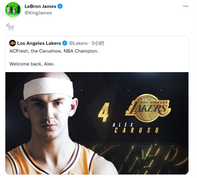 詹姆斯先是转发了湖人官方为卡鲁索制作的致敬短片,转发文案詹姆斯用了一个GOAT的表情。