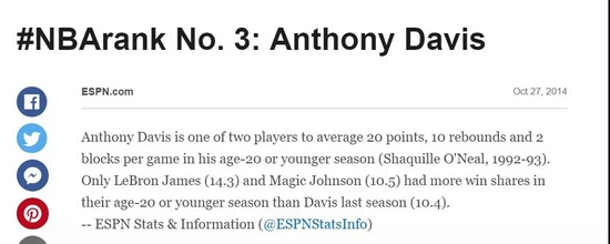 “浓眉哥”安东尼-戴维斯自从出道以来,就倍受全美球迷追捧。美国球评称他为美国内线最后的希望。浓眉也确实争气,第二个赛季就打出了场均20.8分10篮板2.8封盖的华丽数据。球迷们把浓眉选进了全明星阵容。美国媒体也毫不客气,看浓眉就像看自家孩子一样。2014-2015赛季,在浓眉入行的第三年,ESPN就把浓眉排在了自己百大球员的第三名。在他身后的有杜兰特/哈登/库里/威少,一干成名已久且当时或日后都拿到了MVP的超级巨星。