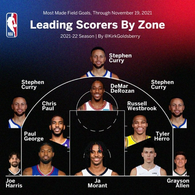 北京时间11月20日,NBA数据专家柯克-高德斯伯里制作了本赛季各区域的得分王一览图。