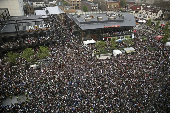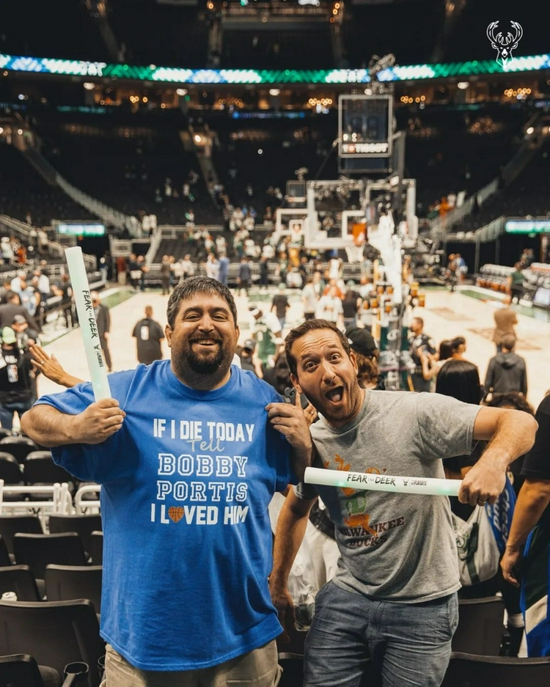 一位雄鹿球迷T恤上写着“如果我今天死了,告诉鲍比-波蒂斯,我爱他”。