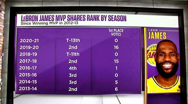 老詹自上次获得MVP以来8个赛季 仅43张第1选票