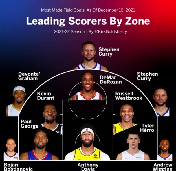 北京时间12月11日,美国媒体近日通过数据研究出一则得分统计,其中涉及到赛场上各个区域的得分情况,将每一个球员表现排列开来。