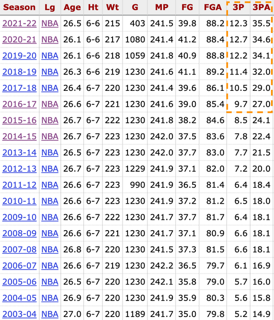 2015-16赛季,联盟场均三分出手24.1次,而2016-17赛季直接涨到27次,自此之后到21-22赛季,场均三分出手已经暴涨到35.5次的历史高峰。