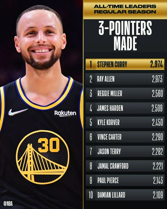当比赛进行到第一节7:34,他命中了个人职业生涯的第2974记三分球,正式超越雷-阿伦成为NBA历史三分王。