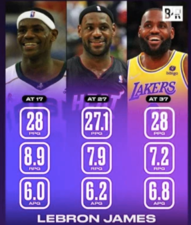 在数据图中可以看到詹姆斯的三个时期的数据,分别是17岁的詹姆斯,27岁的詹姆斯和如今已经37岁的詹姆斯。然而,从詹姆斯的数据场均数据来看,似乎并没有太大的变化。