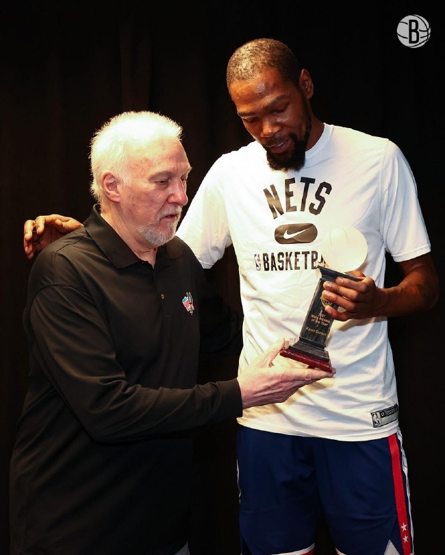 北京时间1月10日,篮网主场险胜马刺。赛前马刺主帅、前美国男篮主帅波波维奇为篮网球星凯文-杜兰特颁发了2021年美国篮球年度最佳男运动员奖杯。