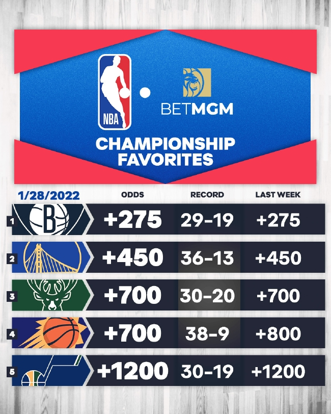 北京时间1月29日,NBA官方发布了最新的总冠军赔率,篮网仍旧位居榜首,湖人跌出前五。