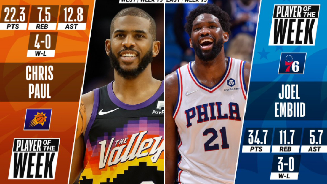 北京时间2月1日,NBA官方公布第15周周最佳球员,太阳球星克里斯-保罗当选西部周最佳,76人球星乔尔-恩比德当选东部周最佳。