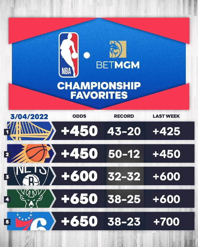 北京时间3月4日,NBA官方发布了最新的总冠军赔率排行,勇士位居榜首,篮网排在第三。