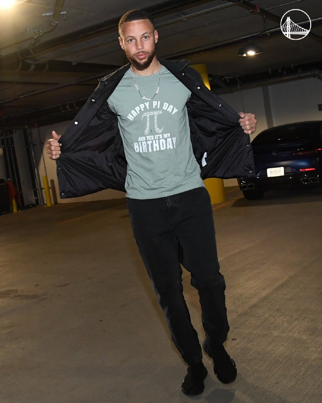 库里的T恤上面写着“π日快乐,然后是的,今天也是我的生日。”