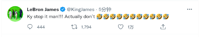 詹姆斯发推感叹道:“欧文,停下来,伙计!!!实际上,请不要停🤣🤣🤣🤣🤣🤣🤣🤣🤣🤣🤣”