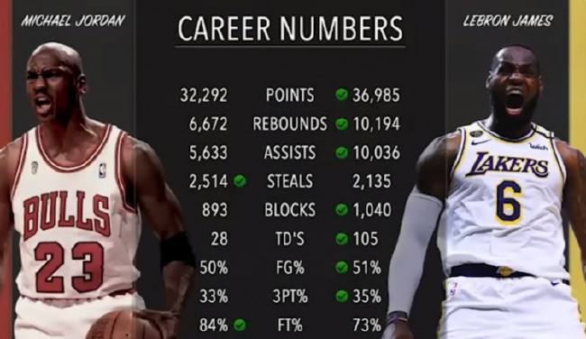 美媒次此对比的是乔丹和詹姆斯二人的生涯总数据。在总得分上,詹姆斯以36985分领先于乔丹(32292分);在总篮板上,詹姆斯以10194个篮板领先于乔丹(6672个);在总助攻上,詹姆斯也以10036次助攻领先乔丹(5633次);在总盖帽上,詹姆斯也以1040次盖帽领先乔丹(893次)。