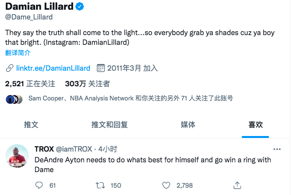 在这位网友发表这条社交动态后不久,利拉德看到立刻点赞,这一动作立刻引起了球迷们的注意。