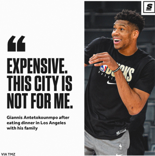 “这(晚饭)真的是太不可思议了,这座城市的消费对我来说太高了,洛杉矶并不适合我。”字母哥直接说道。