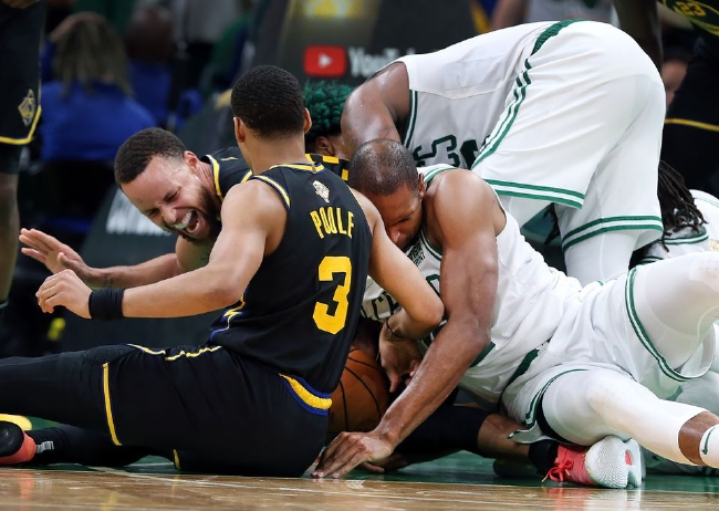 在昨日的总决赛第三战中,比赛末节,库里在一次争抢地板球时被对手压到了脚踝和膝盖,随后起身后库里的表情十分痛苦。