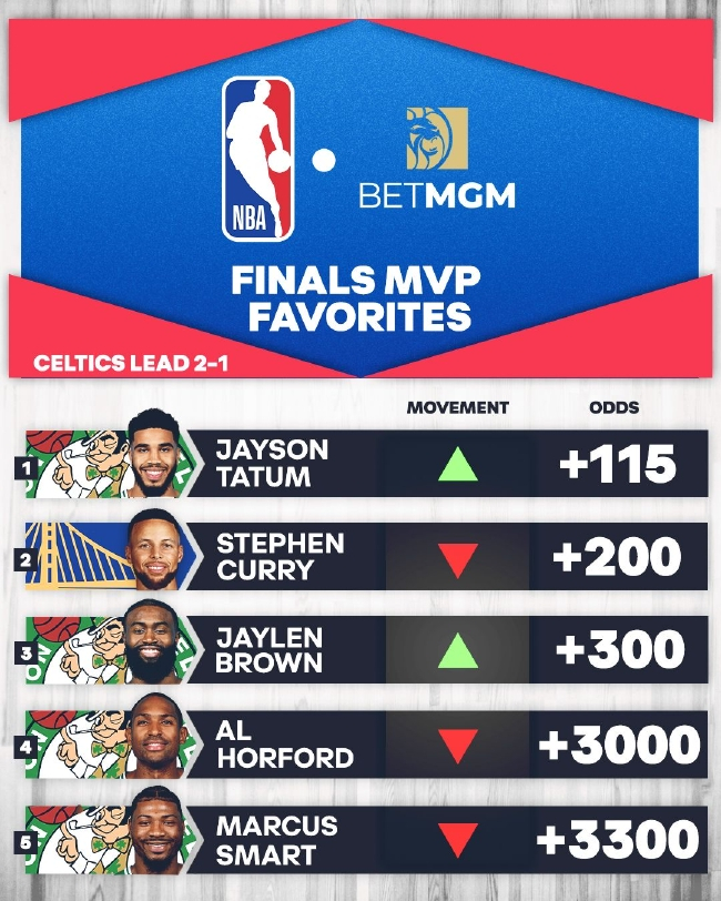 北京时间6月11日,NBA官方博彩公布了最新的总决赛MVP赔率,凯尔特人球星杰森-塔图姆居首,勇士球星斯蒂芬-库里排在第二位。