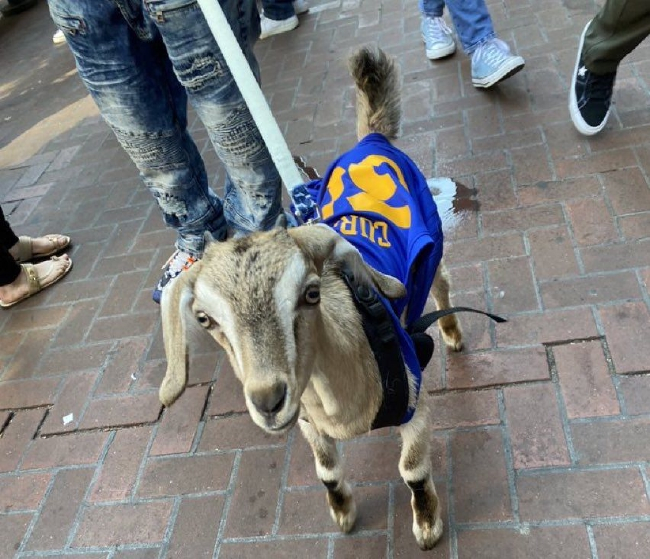 这只山羊成为了勇士夺冠游行中最受欢迎的吉祥物之一,不少球迷都来与它合影。