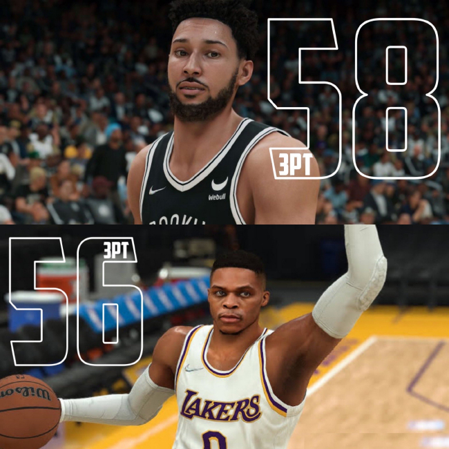 虽然两人都曾入选过全明星,但是威少的能力值比上个赛季一场未打的西蒙斯还低,这的确让很多球迷感到离谱。加上西蒙斯本身投篮就是最大短板,职业生涯一共三分线外34投5中。