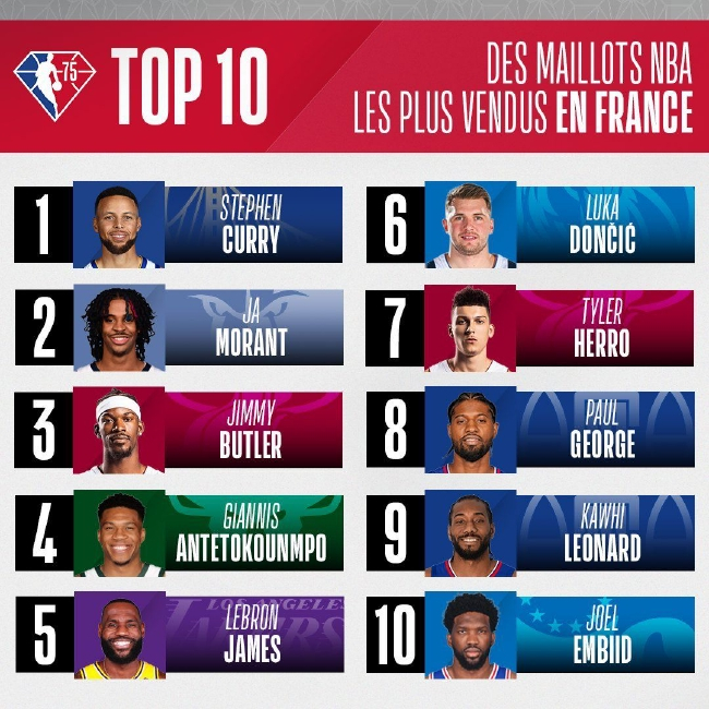 NBA法国球衣销量排行榜:库里榜首詹姆斯第五