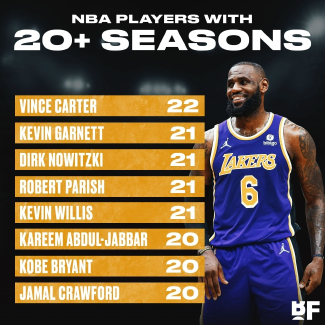 北京时间7月19日,2022-23赛季注定会是詹姆斯的纪录之年,他不但要冲击贾巴尔的NBA历史得分王宝座,还将迎来生涯第20个赛季。《Basketball Forever》统计称,詹姆斯下赛季将成NBA史上第9位生涯出战20个赛季的球员。