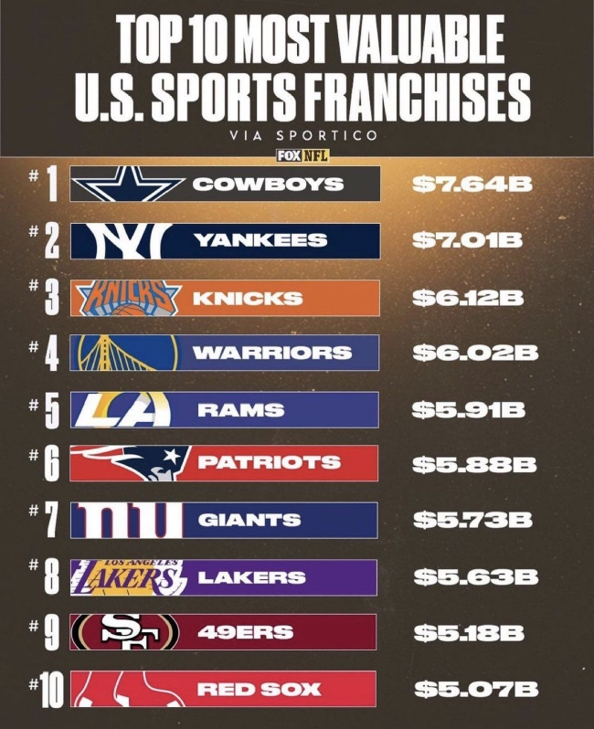 其他上榜的球队分别为:达拉斯牛仔(NFL,76.4亿,第1)、纽约洋基(MLB,70.1亿,第2)、洛杉矶公羊(NFL,59.1亿,第5)、新英格兰爱国者(NFL,58.8亿,第6)、纽约巨人(NFL,57.3亿,第7)、旧金山49人(NFL,51.8亿,第9)、波士顿红袜(MLB,50.7亿,第10)。