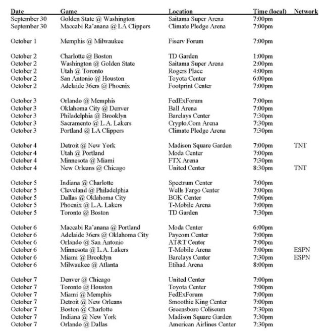 NBA新赛季季前赛完整赛程公布 9月30日开战