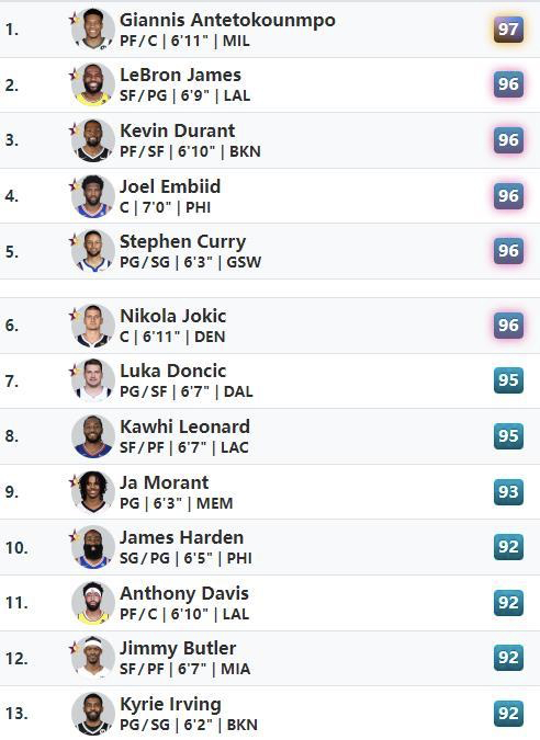 卢卡-东契奇和考瓦伊-莱昂纳德以95的评分,并列排在第七位。灰熊队的当家球星贾-莫兰特排在第9位,76人球星詹姆斯-哈登、湖人内线核心安东尼-戴维斯、吉米-巴特勒和凯里-欧文以92分并列排在第10位。