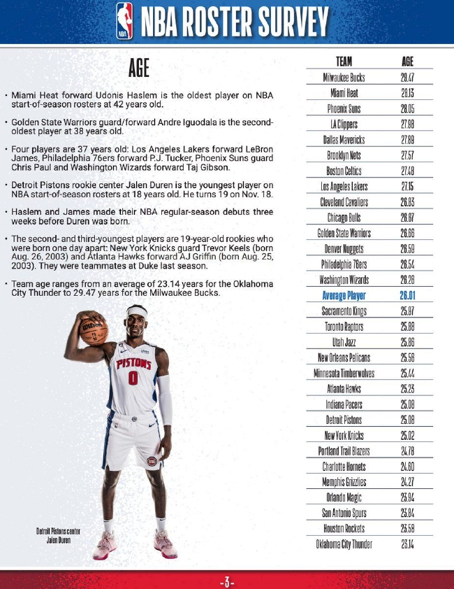 NBA年龄统计:雄鹿最老雷霆最年轻 平均26岁