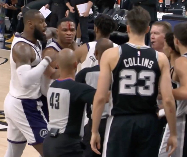 北京时间11月27日,洛杉矶湖人队客场挑战圣安东尼奥马刺,两队比赛进行到第三节末段,拉塞尔-威斯布鲁克在一次进攻中,遭到凶狠犯规,脑门直接被打破。