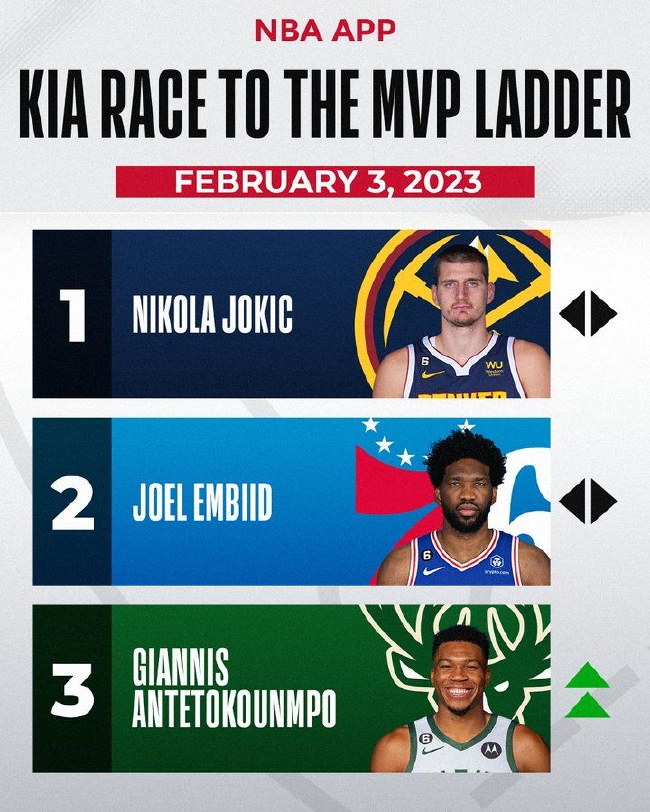 北京时间2月4日,NBA官方更新了最新一期MVP榜单,尼古拉-约基奇继续排名榜首,乔尔-恩比德排在第二,扬尼斯-安泰托昆博重回前三,詹姆斯-哈登排名第七。