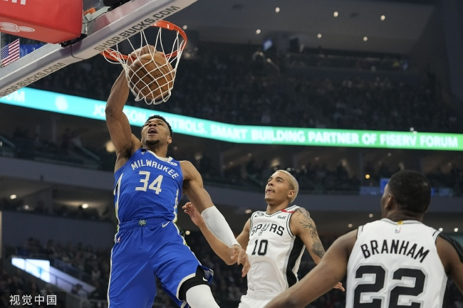 北京时间3月23日,NBA常规赛,雄鹿130-94大胜马刺。