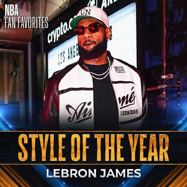 北京时间5月12日,NBA官方公布了球迷票选的2022-23赛季六大常规赛奖项。其中,湖人球星勒布朗-詹姆斯获得年度风尚奖。