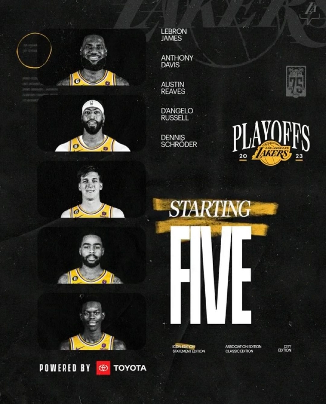 北京时间5月13日,NBA季后赛第二轮,湖人勇士系列赛第六战,湖人官方在赛前公布了今日比赛的首发阵容。