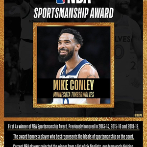 这是康利生涯至今第4次荣获NBA体育精神奖,此前他曾在2013-14赛季、2015-16赛季和2018-19赛季当选过。