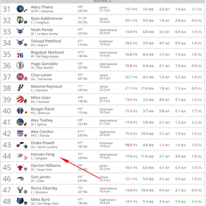 在乐透抽签仪式结束后,ESPN更新了选秀模拟排名,他们预测杨瀚森会在第59顺位被火箭选中。而另外一个网站Tankathon的最新模拟选秀榜单中,杨瀚森则被认为会在第44顺位被雷霆选中。