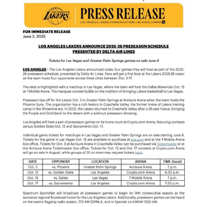 湖人公布2025-26赛季的季前赛赛程(北京时间):