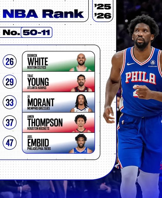 在最新的ESPN百大球星榜单上,恩比德排在第47名,排在他前面的球星有——贾马尔-穆雷(46名)、马尔卡宁(43名)、兰德尔(42名)、贝恩(39名)、祖巴茨(36名)、小萨博尼斯(34名)、特雷-杨(29名)、马克西(28名)、唐斯(27名)、申京(25名)、哈登(23名)、西亚卡姆(22名)、阿德巴约(21名)、莱昂纳德(20名)、杰伦-布朗(19名)、巴特勒(18名)、班凯罗(17名)、布克(16名)、米切尔(15名)、浓眉(14名)、莫布利(13名)、坎宁安(12名)和杰伦-威廉姆斯(11名)。