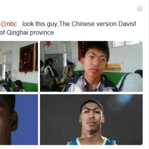 北京时间3月18日,由于长着一对连心眉,新奥尔良鹈鹕队当家球星安东尼-戴维斯因此获得了“浓眉”的外号。近日,有网友找到了一位长相和戴维斯非常相似的中国少年,并将两人的照片一起发到推特上。有趣的是,这条推特还得到了前NBA全明星控卫拜伦-戴维斯的转发。
