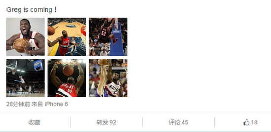 此前,史琳杰在微博上发布了6张照片,全部是奥登在球场叱咤风云的经典照片。史琳杰在微博上写道:“Greg is coming!(格雷格来了!)”