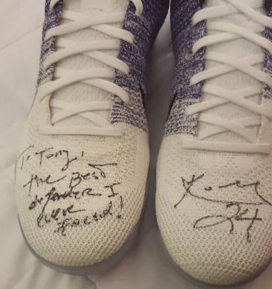 在昨日湖人队主场与灰熊队的比赛之后,科比送给了灰熊队后卫托尼-阿伦一双球鞋,在两只球鞋上科比分别写着“to 托尼-阿伦,我面对过的最好的防守者”和“科比,24”。
